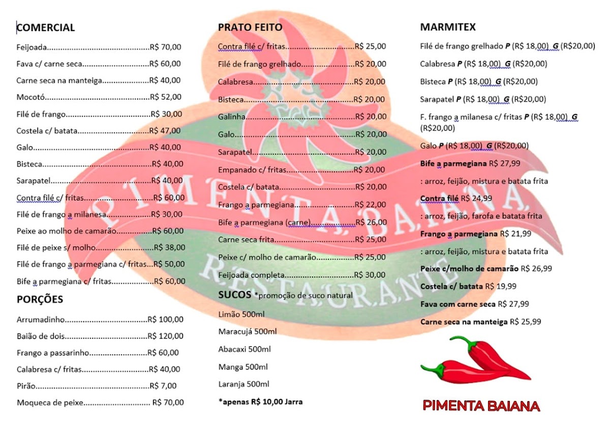 The menu at Pimenta Baiana in Guarujá offers a delightful array of dishes that truly capture the essence of Brazilian cuisine. A standout is the Galinha, a tender and flavorful chicken dish that has earned rave reviews for its seasoning and preparation. Another highlight is the Filé de Frango A Parmegiana C Fritas, a classic take on the beloved Brazilian parmegiana with a crispy fried chicken fillet, complemented by a side of golden French fries. These two dishes exemplify the restaurant's ability to balance comfort and flavor. Other menu items include savory stews, fresh salads, and grilled meats, all prepared with a focus on quality and local ingredients. The generous portions ensure that each dish is both satisfying and fulfilling, making it a great choice for those looking to enjoy hearty meals in a cozy atmosphere.